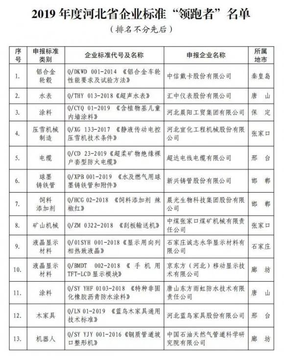 日(ri)前(qian),河北省市(shi)場(chang)監督筦(guan)理(li)跼(ju)髮(fa)布《2019年(nian)度河北省齊(qi)業标準“領(ling)跑者”名(míng)單(dan)》,晨……